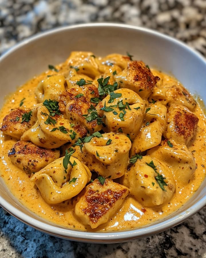 Add the cooked tortellini and chicken to the garlic cream sauce. Toss everything together until the pasta and chicken are well coated. Garnish with fresh chopped parsley for a pop of color and freshness. Serve hot and enjoy the creamy, spicy goodness!